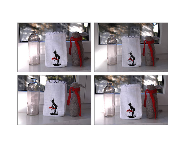 aus weißem Leinen und mit wunderschönen Scherenschnitt Stickdateien von Feinkram bestickt,  sorgen für stimmungsvolle vorweihnatliche Gemütlichkeit.  Ich liebe diese Stickdateien, da sie so Besonders sind. Und ich denke, dass die an Weihnachten Beschenkten sich auch sehr darüber freuen. In die Beutel habe ich ein 1Liter Einmachglas gestellt und in dieses kommt dann ein Teelicht. Eine kleine Wäscheleine hat sich auch noch auf das Leinen verirrt :))